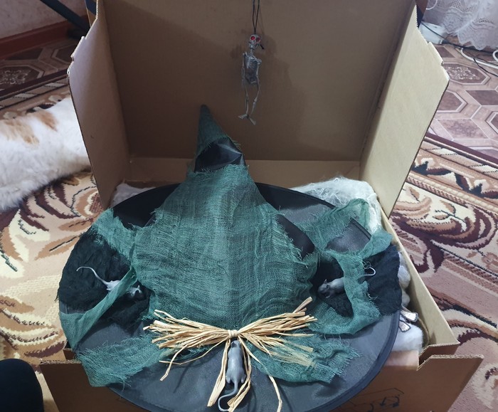 Открываем посылку и видим - скелет-брелок и шикарную шляпу ведьмы.