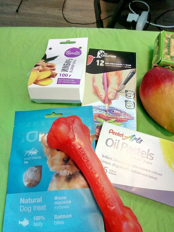 Лакомства мне и собане, кость-пищалка (!), акварельные карандаши и масляная пастель...