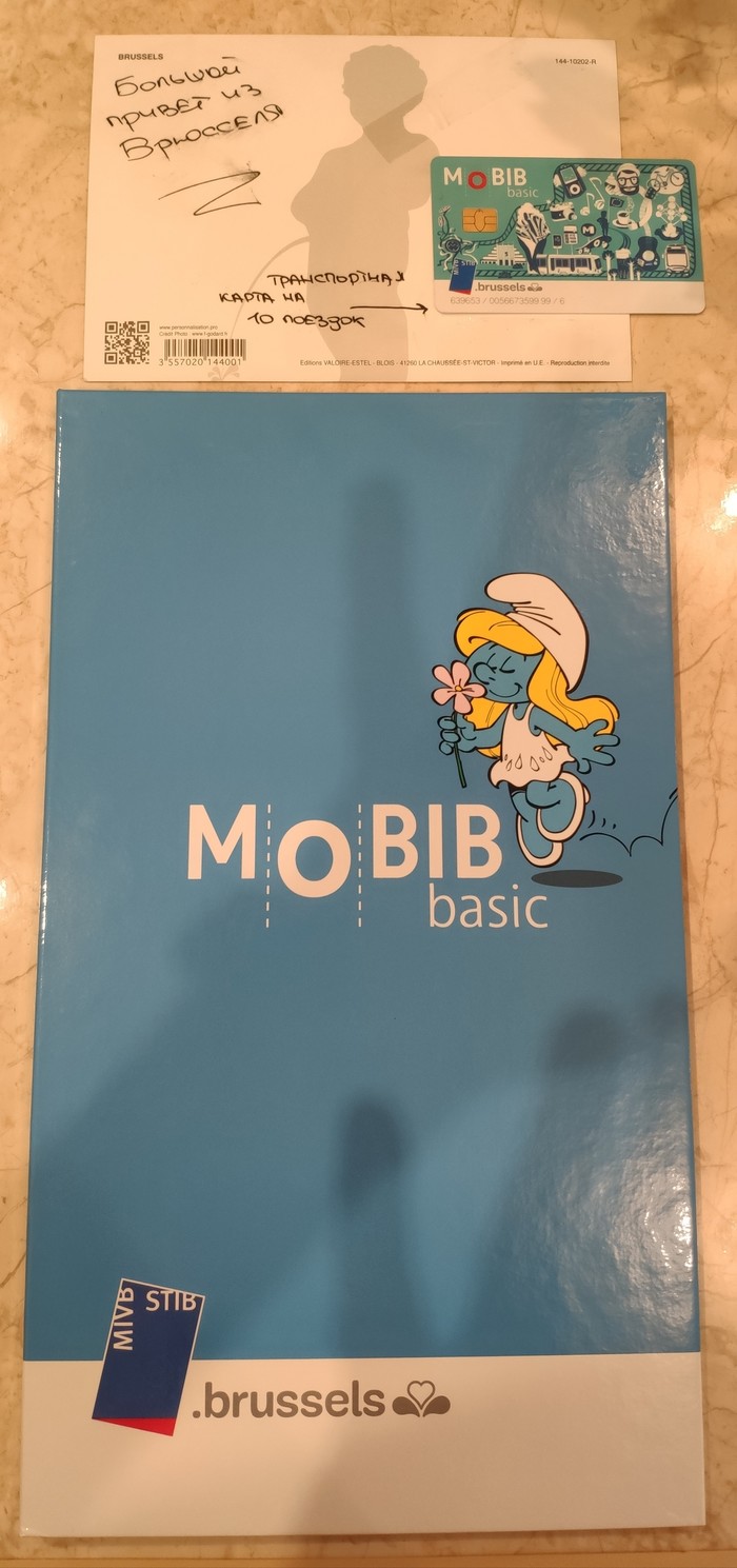 Внутри конверта было коллекционное издание карт в честь 60-ти летия с создания всем известных Смурфиков. Также отдельно лежала карточка на 10 поездок и милая открыта с писующим мальчиком с одной стороны, и видами города с другой.