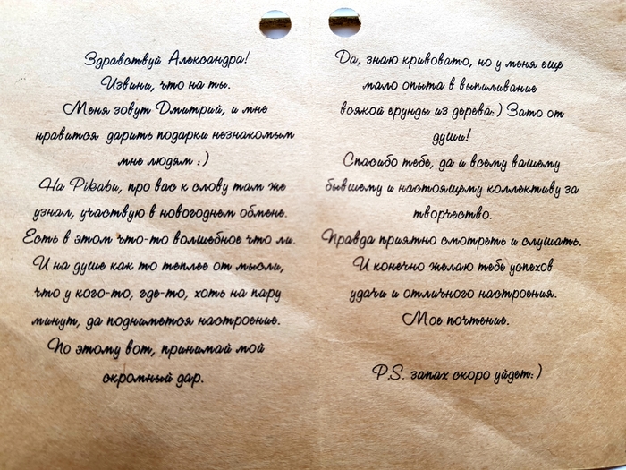 На PIkabu, про вас к слову, там же узнал, участвую в новогоднем обмене. Есть в этом что-то волшебное что ли. И на душе как-то теплее от мысли, что у кого-то, где-то, хоть на пару минут, да поднимается настроение. Поэтому вот, принимай мой скромный дар. Да, знаю кривовато, но у меня еще мало опыта в выпиливании всякой ерунды из дерева:) Зато от души!