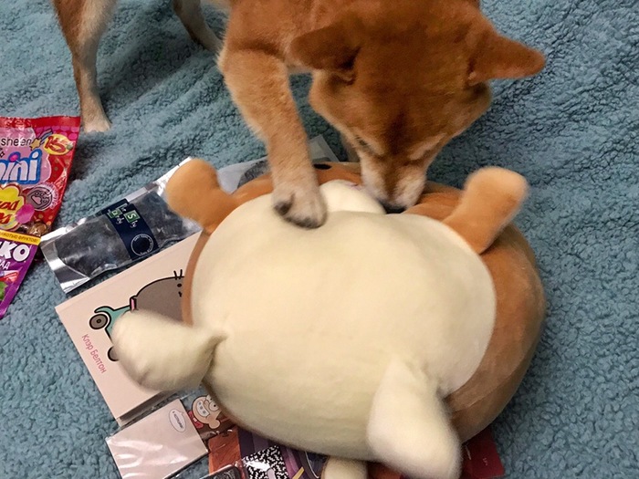 Прекрасные и очень оригинальные подарочки! Тут вообще вот все, что я люблю: сладости (поржала с метконфет), книга про Пушин кэт и маска для сна, стикербук с Риком и Морти, магнитики!!! И огромная обнимательная сиба ину, которая не сопротивляется и не пахнет собаканькой)