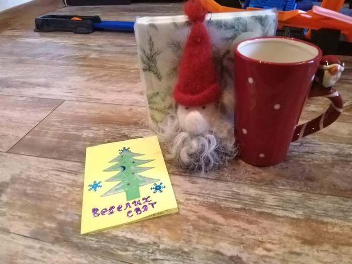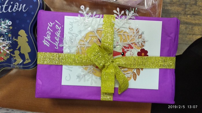Сначала что-то даже не подумала глянуть, написано ли что-нибудь с другой стороны круглешка, но когда я открыла коробку, он сам перевернулся и открыл мне такое вот послание от моей Снегурочки:)