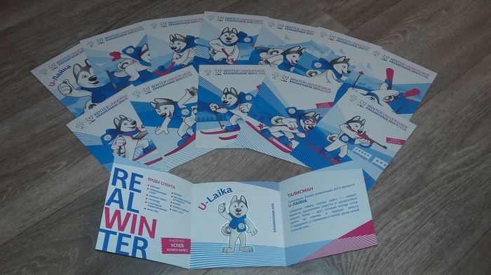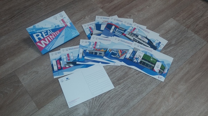 Я уже умилилась до жути, ибо это не посылка, а персональный мини райский уголок. Итак, по порядку. Сверху лежат красивые открытки с объектами зимней универсиады. Под ними был ещё конверт с открытками, но уже с зимними видами спорта, а также вот такая огромная наклейка: