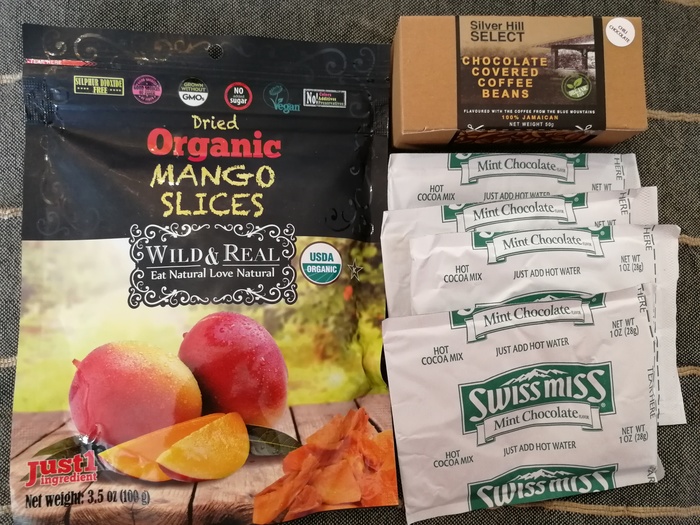Манко сушеное, шоколад горячий растворимый свеженький, и кофейные зерна в шоколаде - очень интересные на вкус. Признаюсь честно, свежее манго вкуснее)) Шоколад ещё не пробовала. Кофейные зерна погрызла, муж потом спать уложить не мог!!