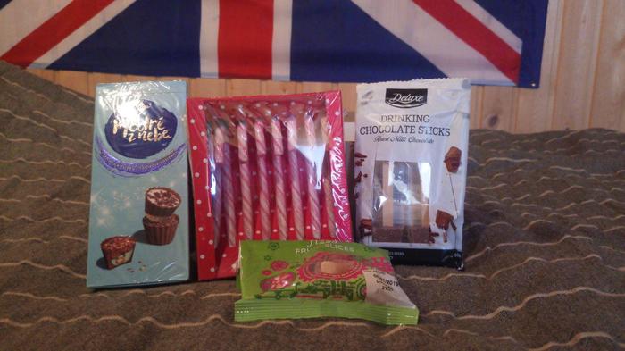 Следующий набор радостей идет бок о бок с только что заваренным чаем. Конечно, сладости! Причем много разных, все в духе Нового Года, даже те самые, полосатые палочки, которые так часто мелькают в кино, и увы так редко на полках наших магазинов.