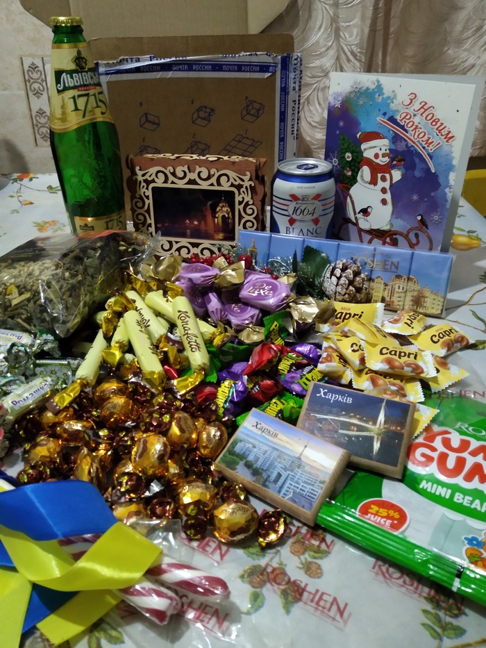А там... Чудесная новогодняя открытка, много-много конфеток, шкатулка, травяной чай, магнитики.... и то, что оказалось, ко времени и к месту, в деревне, после баньки - украинское пиво :))