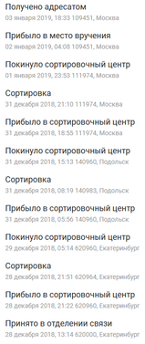 Поводов сомневаться у меня не было, и, собственно, на следующий день я получил трек и стал с нетерпением ждать. Почта России не подвела, всё прошло быстро (6 дней, и это в самый Новый год!):