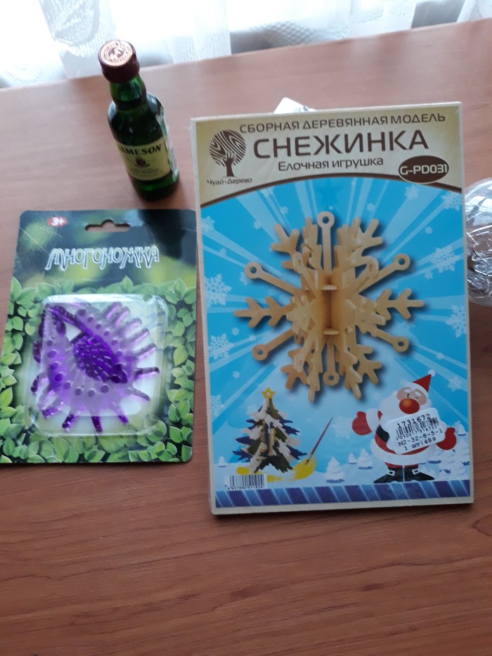 Снежинку собрал(было нелегко), и даже не сломал ничего).Многоножкой напугал уже жену, пришедшую с работы(она липкая и холодная).Игрушки на ёлке.Бутылочку поставил как взрослую к большим бутылкам, пусть там живёт.Конфетки сейчас будут с чайком нас радовать.А конструктор соберём с племяшкой.Ну и конечно же огромное спасибо тебе от кота, коробка подошла.Реально как дети радуемся, приятно до дури, записка ещё такая клёвая, ты наш лучший дед мороз в этом году)