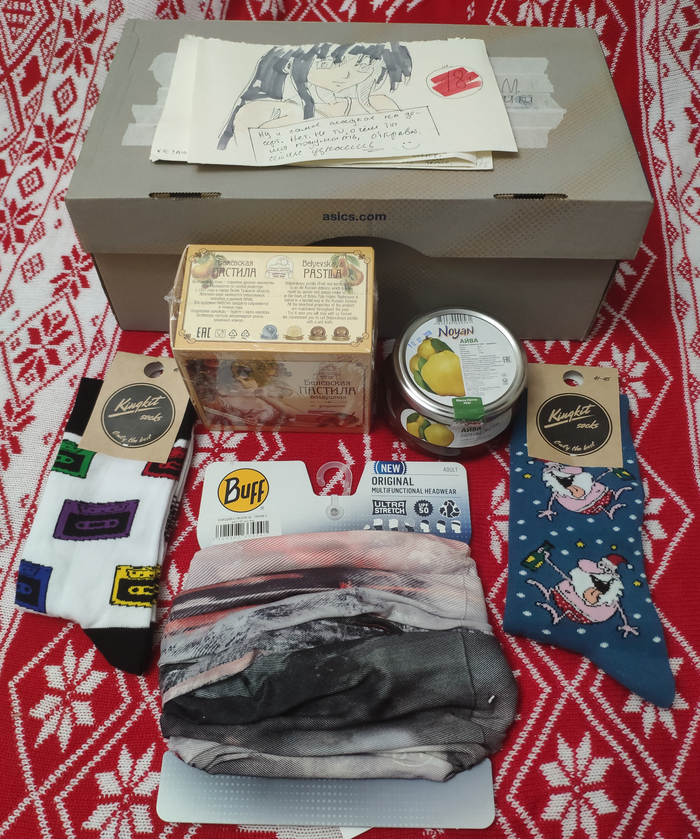 Вскрыв пакет, я увидел коробку от беговых кроссовок Asics. Первым делом повертел её в поисках наклейки с моделью и размером (оказались великоваты), потом прочитал послание на крышке: