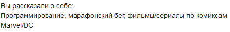 В интересах указал всё, что успел, так как регистрировался в последние часы, если не минуты. Но и этой информации хватило моему Дедушке Морозу, чтобы порадовать меня креативным подходом к оформлению подарка (и полезными вещичками)