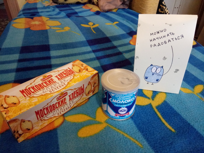 Отчет по обмену подарками(не с Пикабу(ха-ха...ха...)) и мой второй пост. Сегодня спускаюсь вниз по подъезду и увидев извещение, сразу побежал на почту. Вечер обещал быть счастливым - никакой очереди и вежливые служащие. От счастья сразу вскрыл посылку, забыв ее сфотографировать. Но традиционный котик с посылкой.