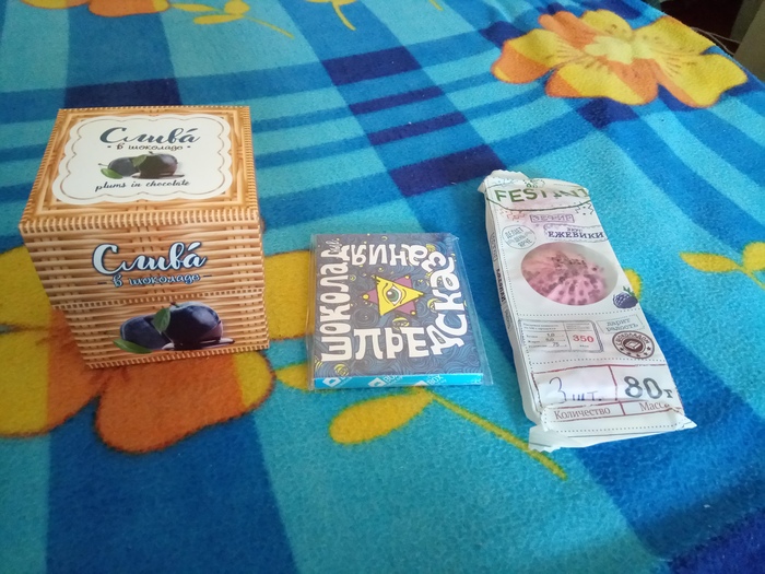 Много белорусских сладостей: печенье, сгущенка, конфеты, сливы в шоколаде, шоколадные предсказания и зефир.