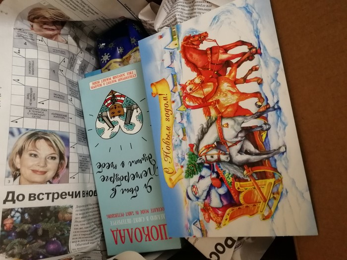 А внутри... Куча сладостей, новогодняя открытка, от содержания которой и у меня, и у мужа(да что там, даже у кошки) побежали мурашки.