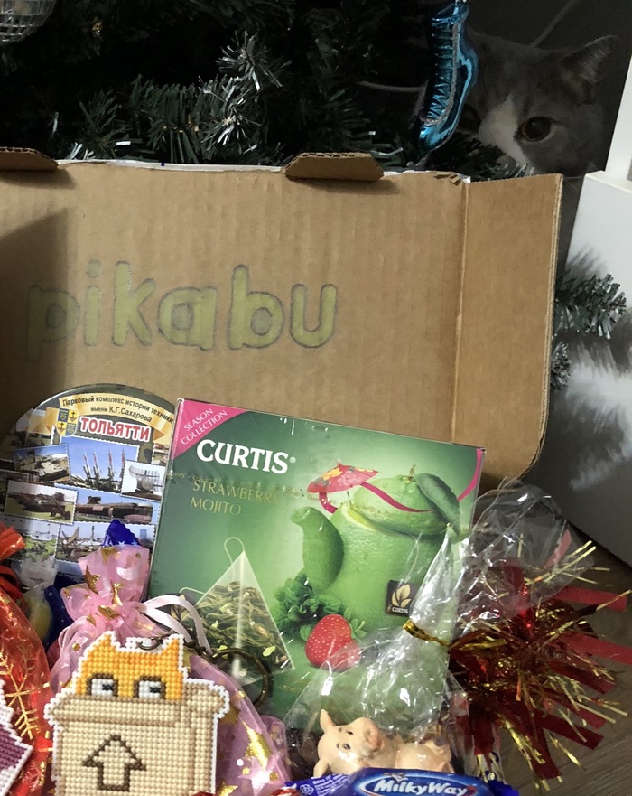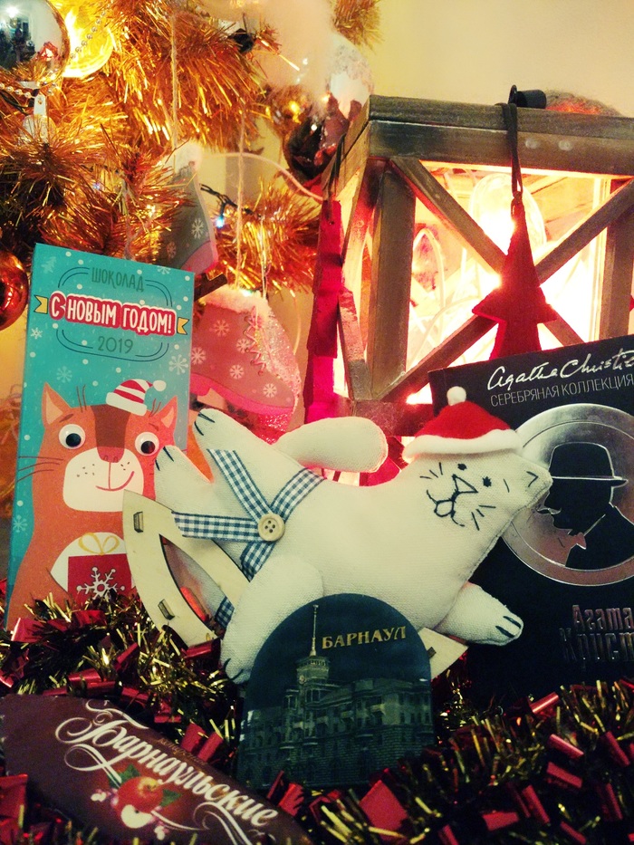 Мои дарители учли всё, что я написала в анкете: в подарке были огромные барнаульские конфеты, шоколад с котиками, коробочка с поделкой, которую нужно было сделать своими руками, магнитик, мишура, символ года и милая открытка.