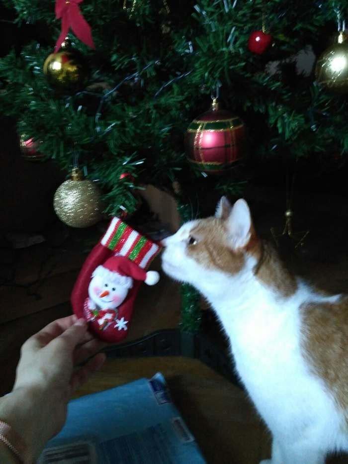И тут красота! Милый и приятный носочек (наверняка для конфет или украшений) на новогоднюю ёлку. "Это мы любим!" - яростно обнюхивая носок, промявкал кот.