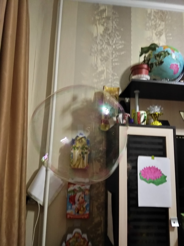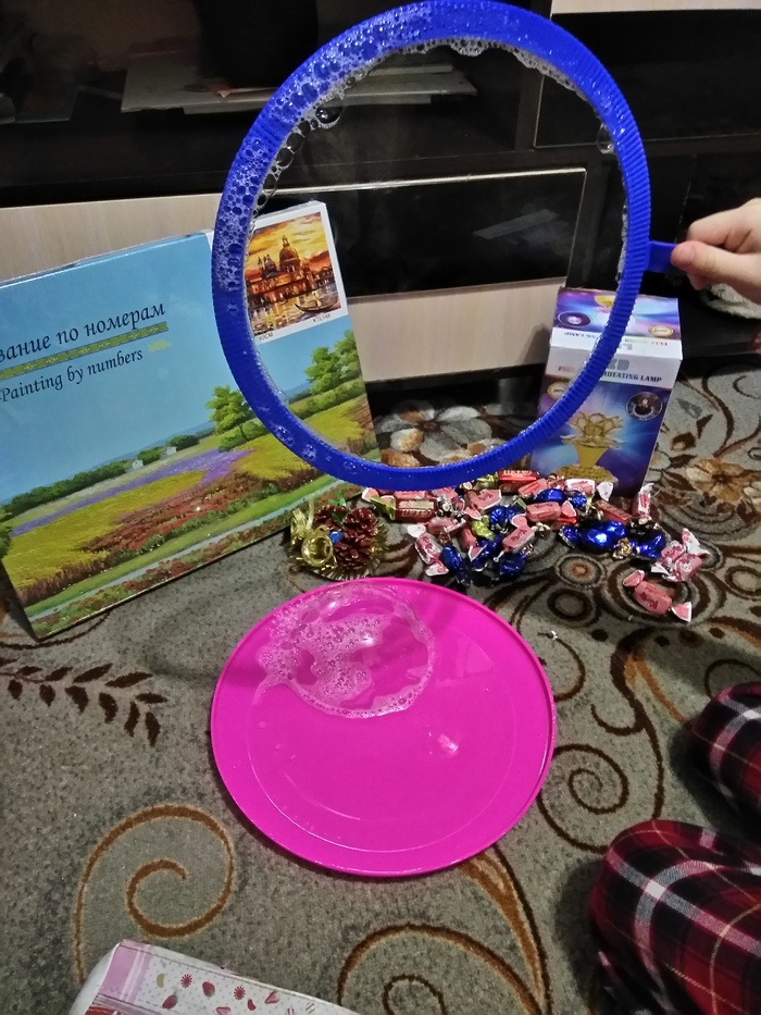 Старшая уже во всю играть с набором для мыльных пузырей, телек,диван,ковер все что можно было намочила)