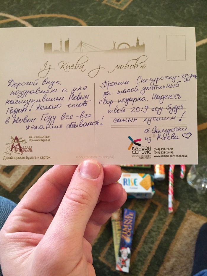 Под пледом было две шоколадки, две печки бенгальских огней, пачка вафелек и открытка подписана собственноручно.