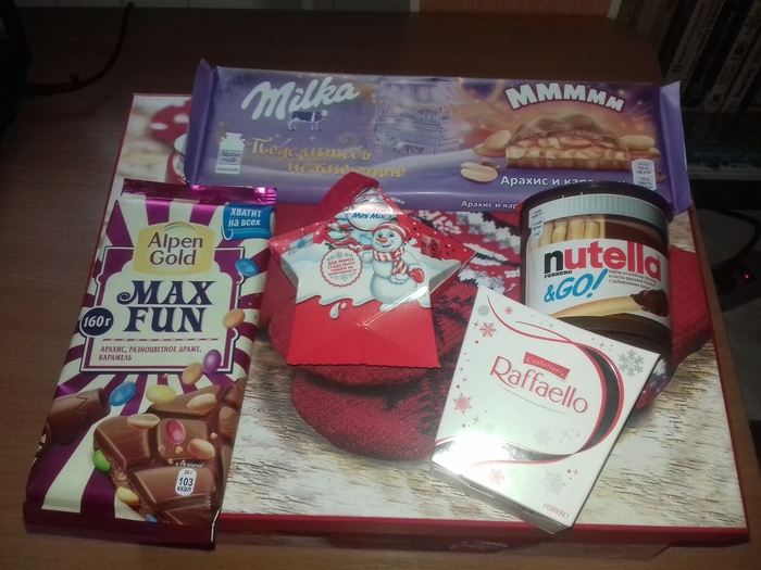 Вскрываем, а внутри ещё больше тайн, немного конфет, кстати как бы это не звучало банально, но с батончиками снегурочка угадала. В своё время меня на них подсадила моя девушка, до этого и знать о них не знал, и теперь они одни из самых любимых мной конфет.