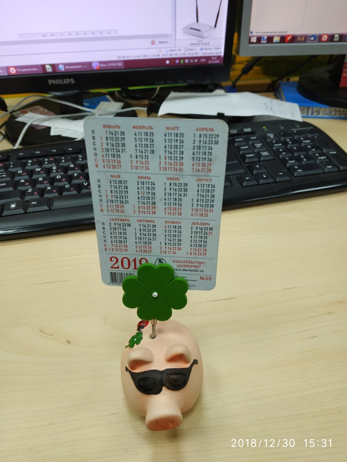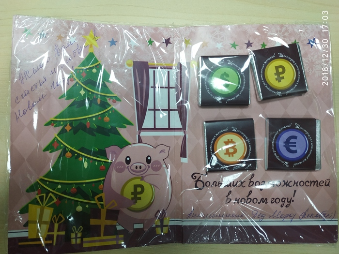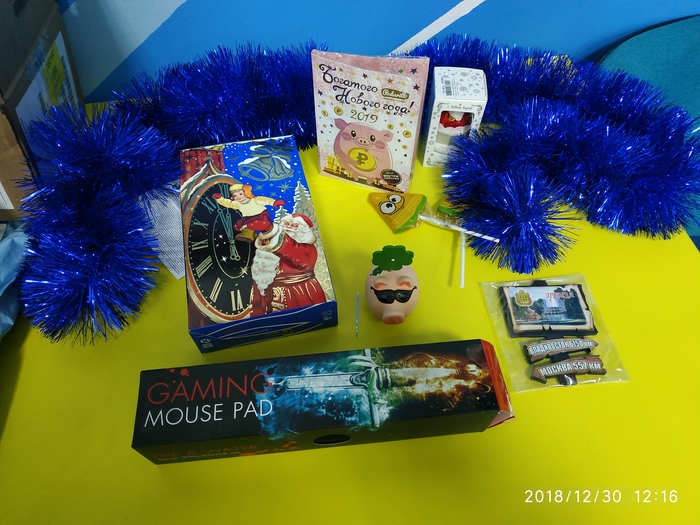 В посылке нашел милую открытку с пожеланиями, держалку заметок в виде модного свина с четырехлистным клевером, огромную упаковку наивкуснейших пензенских конфет(весь коллектив заценил), ёлочную игрушку ручной работы и яркую елочную мишуру синего цвета.