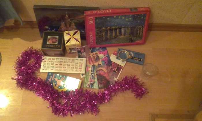 Набор замечательных блестящих ручек, для украшния обратной стороны открыток для посткроссинга=) Букля - игрушка на ёлку =) Волшебный магнит из Екатеринбурга =) Позитивный шоколад =) Вкуснейшие конфетки =) Медалька для биолога, т.е. меня =) Конфетки-ностальгия Лав из =) И милые посткроссинговые открыточки =) А, ещё оооочень полезная ручка =)