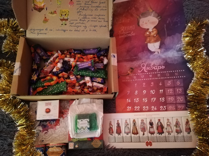 А дальше подарки-подарки: чудесный календарь, раскраска своих мыслей (мне как раз в новом году пора ими заняться)), мыло, настольная игра и вкуснейшие сладости! :)