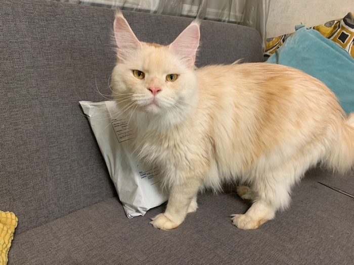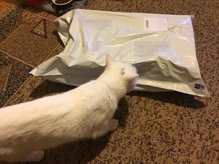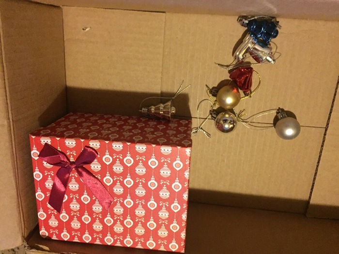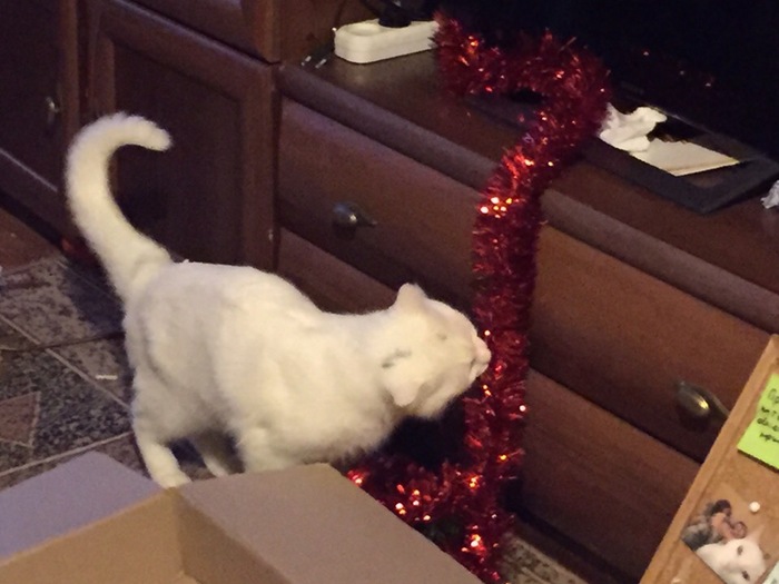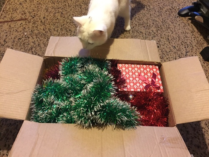 По традиции все началось с котоинспекции. Когда я открыла пакет, то сразу заметила пробивающуюся из коробки гирлянду. Котейка её несомненно тоже увидел и проявил еще больше интереса. Мне кажется он подумал, что это был подарок для него...