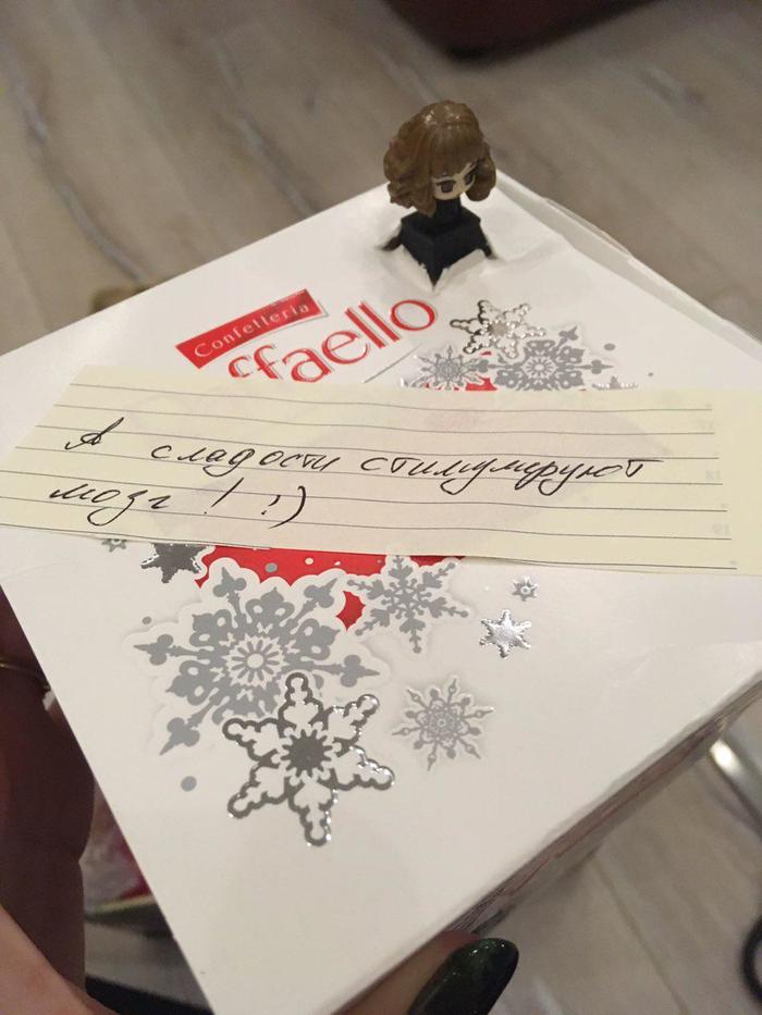 Вот такую коробку я получила - 2,5 килограмма радости! Чёрт возьми, подарок просто прекрасен! Я довольна до поросячьего визга)) Внутри оказалась куча вкусняшек: сладости, чай, специи... И еще миленькая открыточка, но что в ней написано - я вам не покажу (≖‿≖)