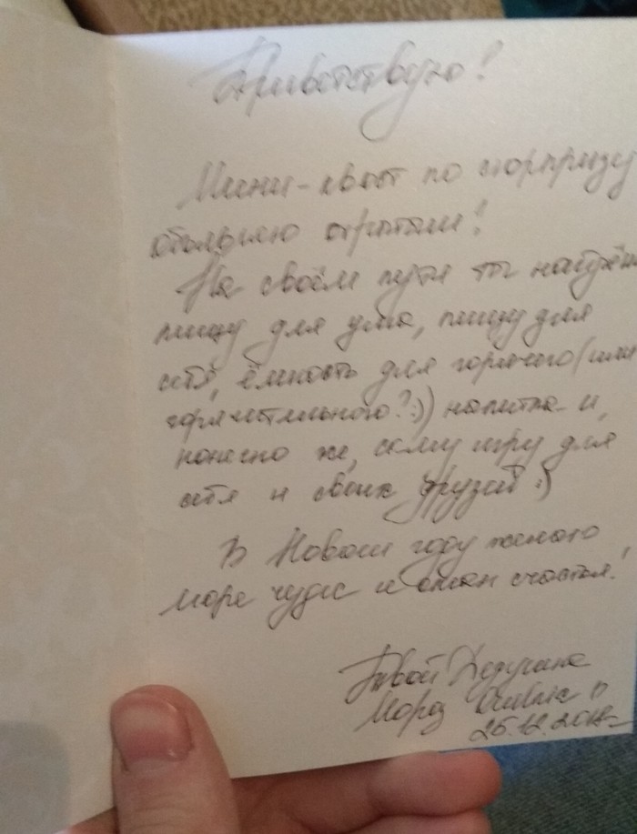 Сказать что я удивлён это ничего не сказать. Я первый раз принимаю участие в этом проекте, и я очень рад что мне пришёл подарок :) В канун нового года это даёт веру в добрых, отзывчивых людей. Ну и конечно же новогоднее настроение стало намного лучше!