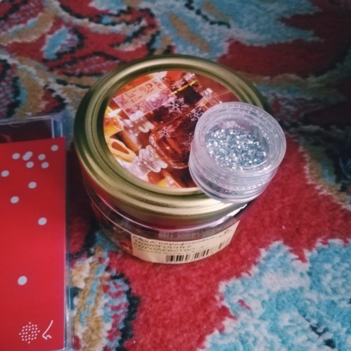 Далее, я уловила носом, дивный пряный аромат из большой баночки. Что же это?А это Новогодняя свеча с запахом ванили и вишни! Безумно приятно пахнет. А рядом с ней обнаружилась баночка с блестками. Как раз пригодится для декорирования открыток к предстоящему празднику.