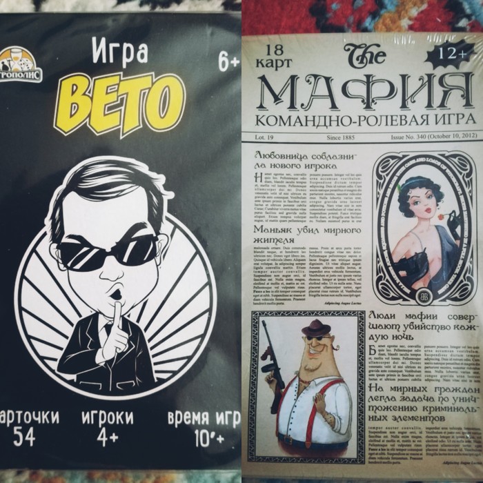Подарков вытащила уже кучу, а коробка еще и на половину не разобрана, что за чудеса? Тем не менее, мы упорно двигаемся к ее дну. Далее меня ждало комбо настольных игр для большой компании:  "Мафия" и "Вето". Давно хотелось в них поиграть, да все никак руки не доходили купить. А тут прям как раз. :)
