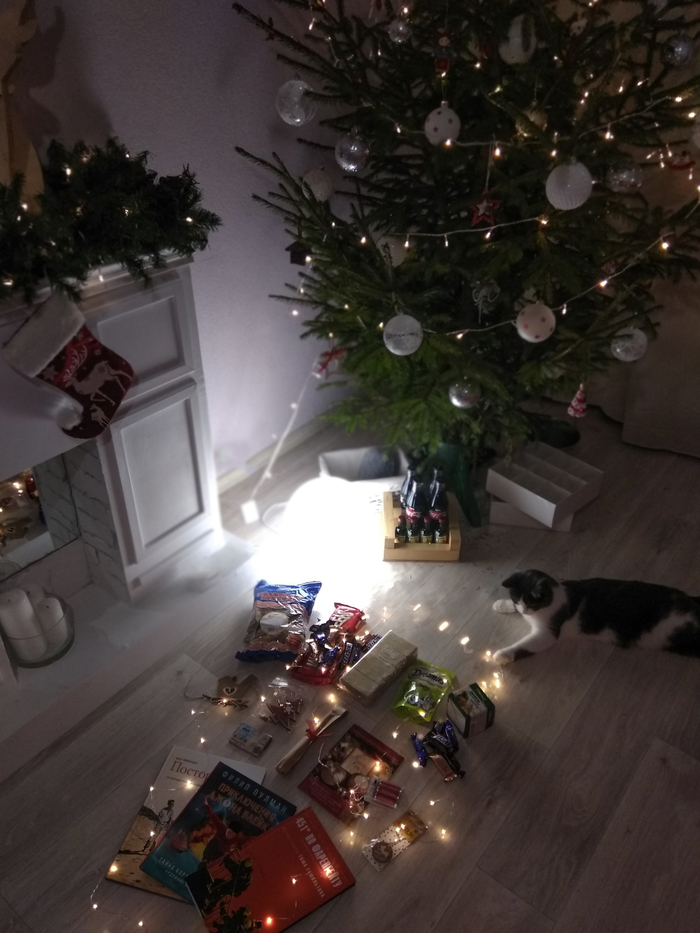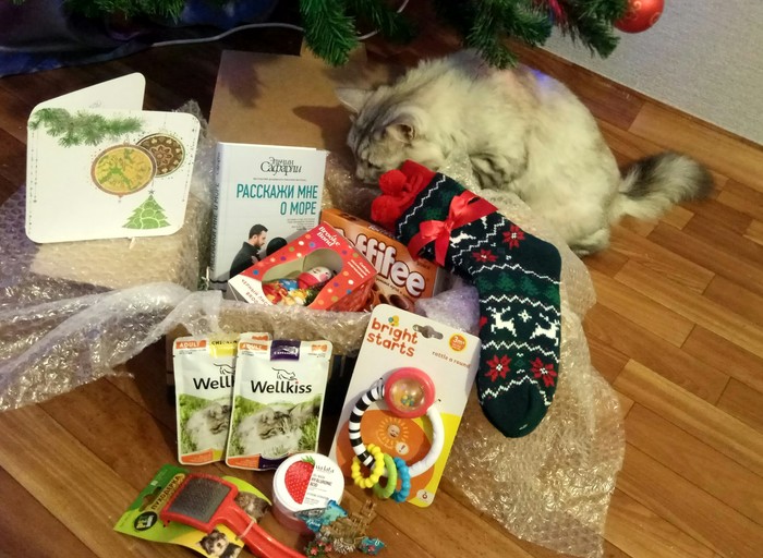 Трясущимися руками вскрываем упаковку иии... Настоящее новогоднее чудо!!! Конфеты, чай, милые носочки, маска для лица! Открытка с безумно тёплым пожеланиями! Книга так вообще самый лучший подарок для того, кто ещё совершенно не представляет чем будет заниматься в декрете)) Подарочек будущей доченьке и, конечно же, Феликс так же не остался без подарков и получил корм и чесалку)))