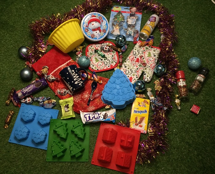 Большое спасибо за потрясающую новогоднюю кружку! А ещё за конфетки, печенье, за Nesquik(!), за специи, прихваточки, формочки для печенья, ёлочные игрушки великолепны(один из моих любимых цветов), полотенчики уже используются))