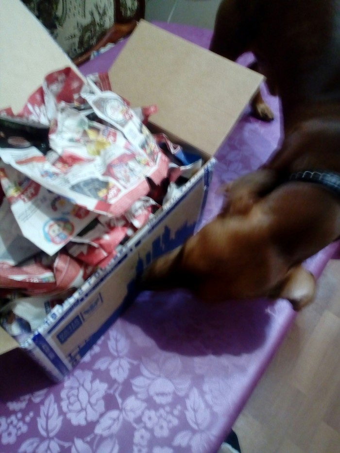 Кот посылочку проигнорил т. к. очень ленив зато такс тут как тут
