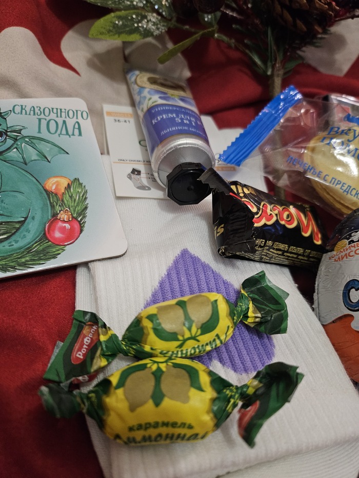Общий вид, а именно 4 конфеты, 3 ломтика киндера, хотя в упаковке вроде минимум 4 (кто-то одну амнямням) , 2 магнита, крем маленький( то же из набора), маска тканевая, носки новые ( повезло)), печенье с предсказанием ( есть не стала, даты нет) и обгрызанная веточка)))