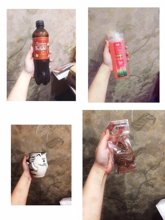 Вот общее фото всего-всего подарка, а ведь приятностей в нем не мало - это и чай для новогоднего настроения (он нереально пахнет, даже без вскрытия упаковки), кофе для турки, куча сладостей и офигенный, пахнущий шоколадом, гель для душа и крем для рук для очень сухой кожи (что в зимнее время особенно актуально)