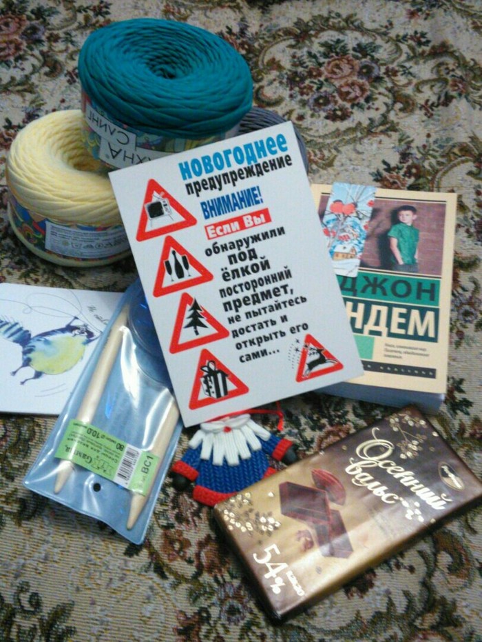 Это трикотажная пряжа и спицы для нее (давно мечтала попробовать вязать из такой пряжи!), книжка с интересным описанием (не терпится начать читать!), прикольная подставка под кружку, новогодний брелок (Как будто вязанный! Круто!) иии... шоколадка!