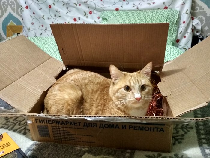 Коробка кота заинтересовала.  Общий вид.