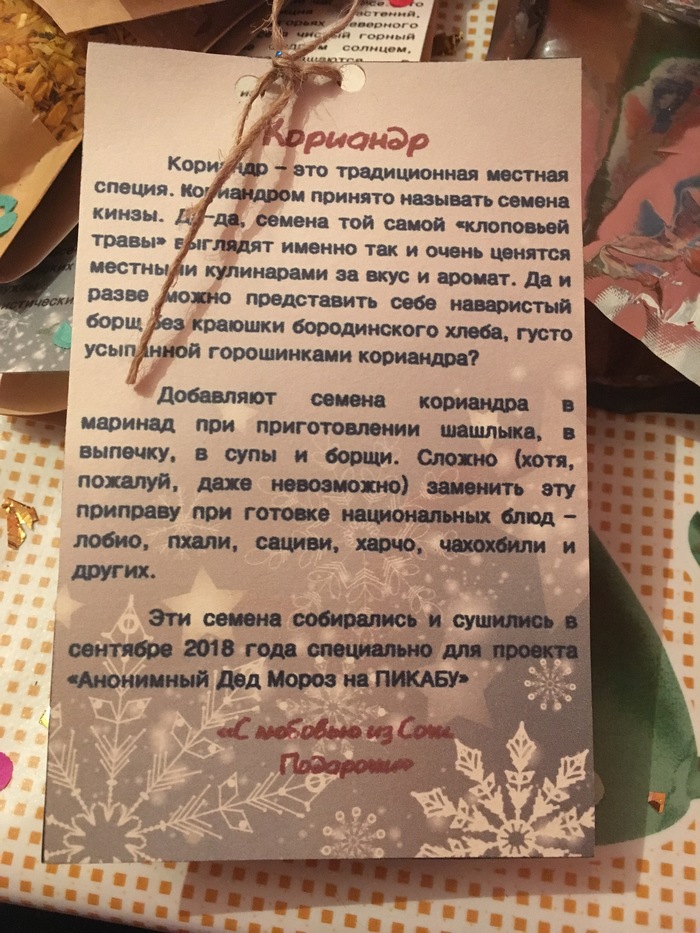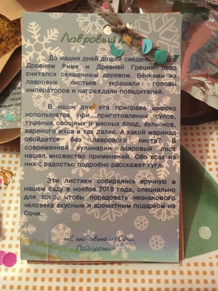 Ну а дальше-все как в тумане... Вы только представьте: целая коробка специй и различных вкуснях! И к каждому миленькому мешочку имелась записочка от Снегурочки:3 Я покажу вам только некоторые из них