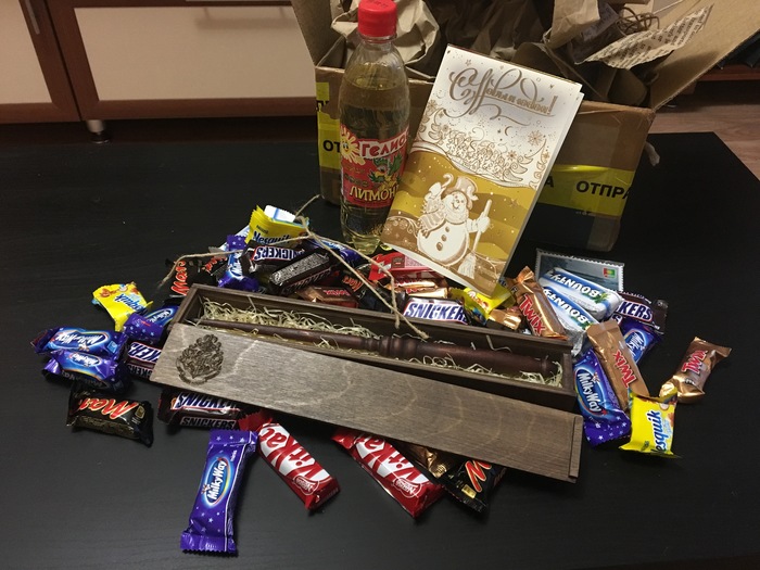 В коробке лимонад, конфеты, магнитик (не сфотографировал), открытка и еще одна коробочка, довольна таки не плохо упакованная. Я почти сразу догадался что там может быть, наверное и вы) В  графе о себе я указал что являюсь поклонником вселенной о Гарри Поттере, заметил что на пикабу таких много)