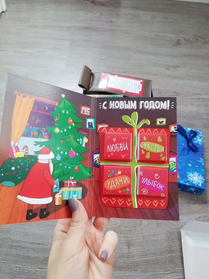Письмо от Дедушки я варварски вскрыла, забыв сфотографировать отдельно, а в нем оказались поздравления и открытка с ещё одной шоколадной заначкой(это уже лично для меня)