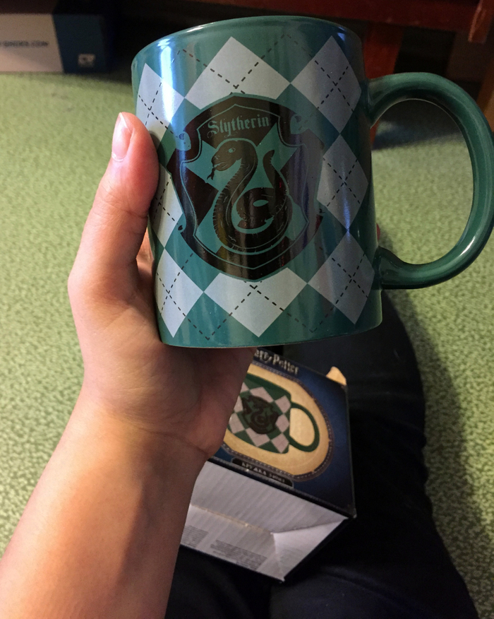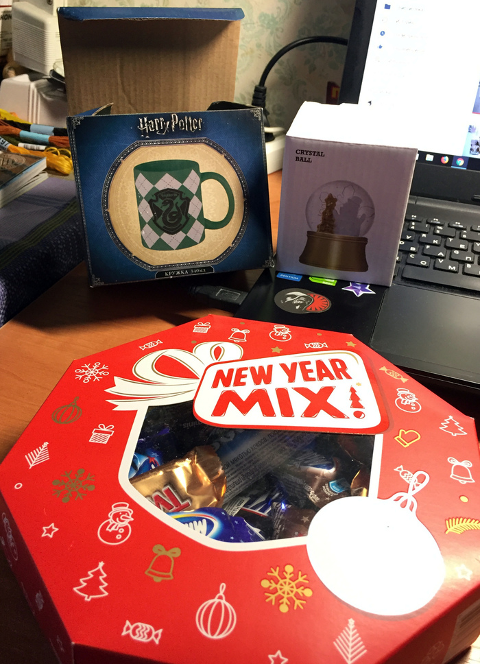 Шарик со снегом, конфетки и кружка Гарри Поттер с факультетом Слизерин! И как мой дед Мороз догадался, что именно Слизерин - мой любимый факультет?))