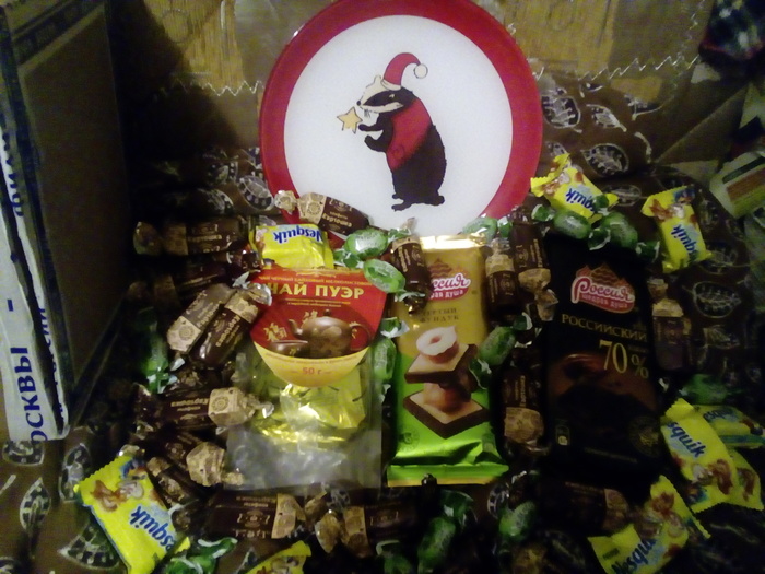Новогодняя тарелка с барсуком (наверное), куча конфет и шоколадки (надо бооооольше какао!!!!). Часть конфет не дожила до фотосессии, потому что подарок пришлось вскрывать на работе и делиться сладким с коллегами) Зато пусть теперь мне завидуют, мне снегурка вот сколько интересного прислала