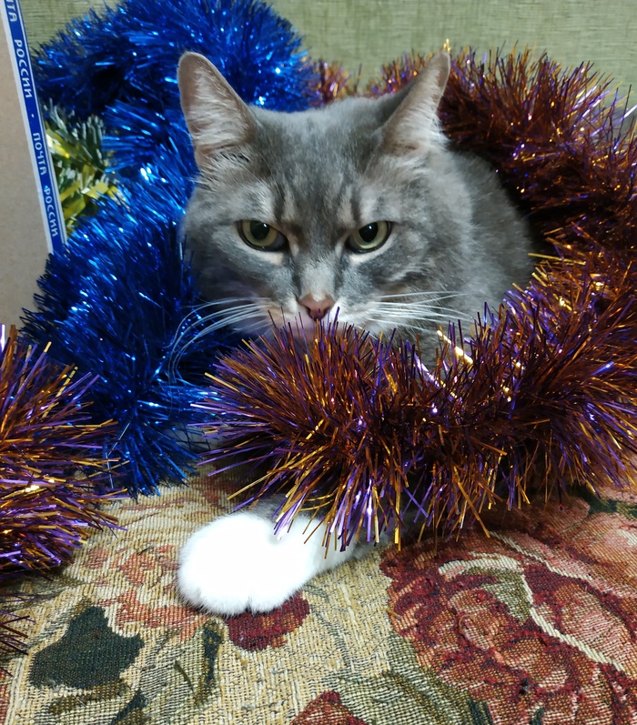 Мишура! Много яркой и красивой мишуры! Кошка сразу её оккупировала: