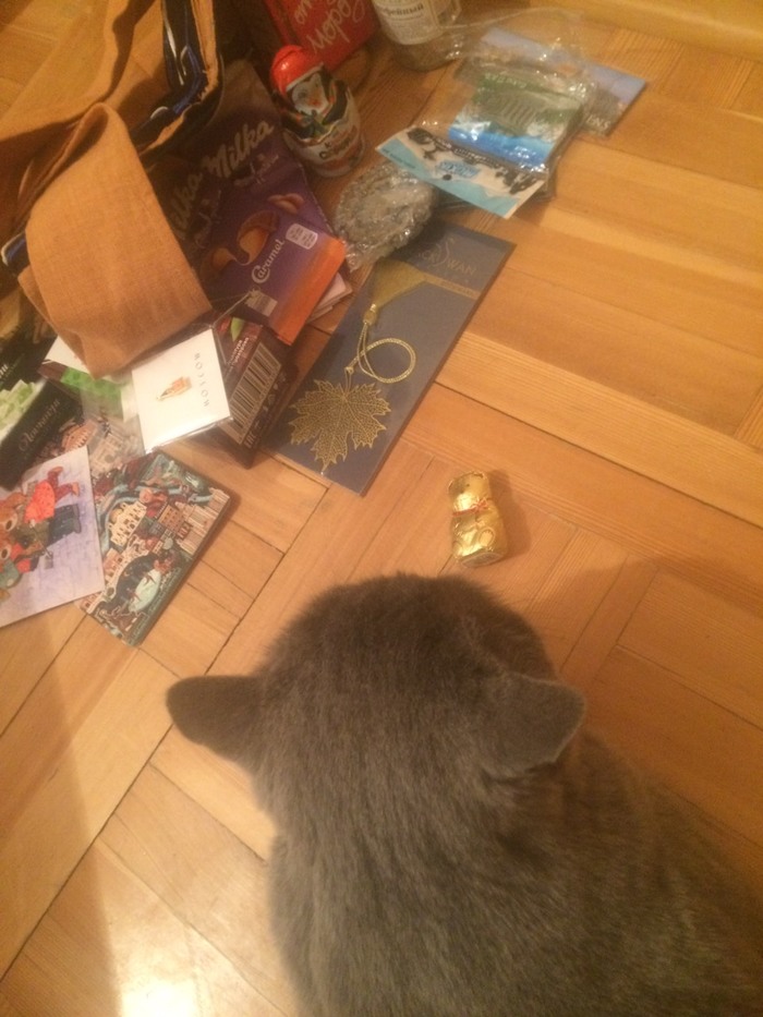 Очень быстро в содержимом нашлась небольшая взятка нашему пушистому котоинспектору. Таможня дает "добро") Муж как-то незаметно умыкнул шоколадку с кокосом. В общем, все довольны)))
