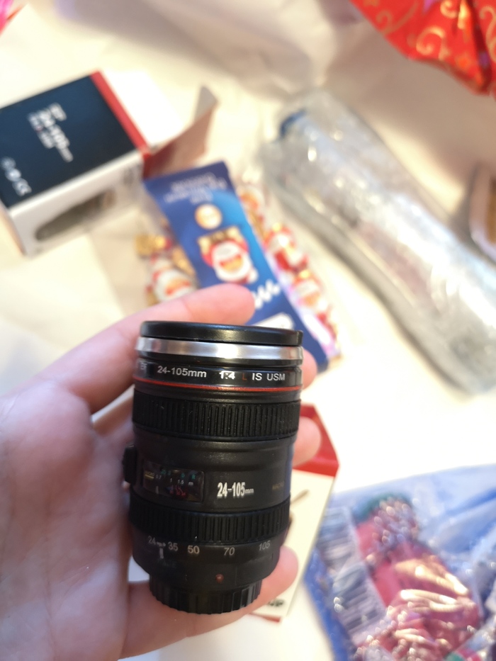 Две маленькие кофейные чашечки (или стопочки, хи-хи) в форме объективов!! А ещё в мешочке с леденцами позднее обнаружился ещё один мешочек с подвеской в форме фотоаппарата и цепочкой.