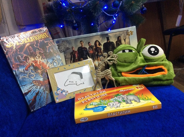Куча чупа-чупсов, пластилин, милейшая рамочка, внутри которой новогодний бонго кэт. Лягушонок Пепе?) Так же с заботой завернутая в пупырку елочная игрушка - восхитительный олень, уже заняла свое почетное место: