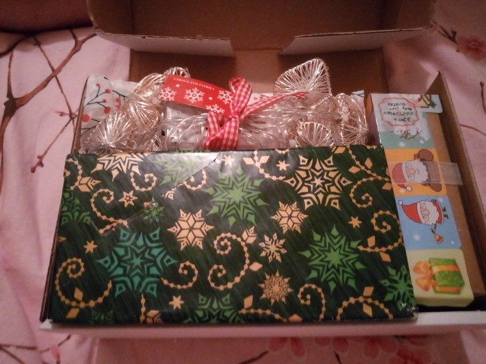 Дошла моя посылочка из другого конца страны! 13 дней и она у меня в руках. Первым делом меня встретила открыточка с пожеланием) Со снегурочкой мы немного пообщались в сообщениях, очень приятная девушка.