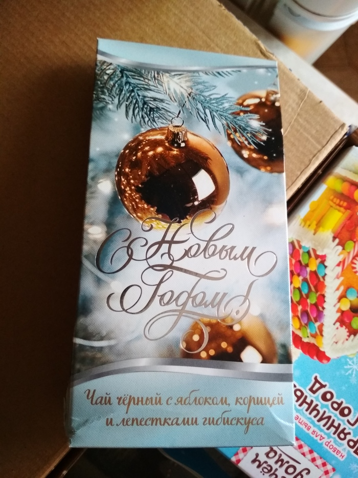 Девушка в пожеланиях о подарке написала, что согласна на сюрприз. Посмотрев ее страницу, я узнала, что ей интересно рукоделие. Поэтому было решено отправить новогодний декупаж. Также у девушки есть маленький ребенок, которому и предназначалось печенье "Барни". Ну и плюс красивая открытка и чай в праздничной коробке.