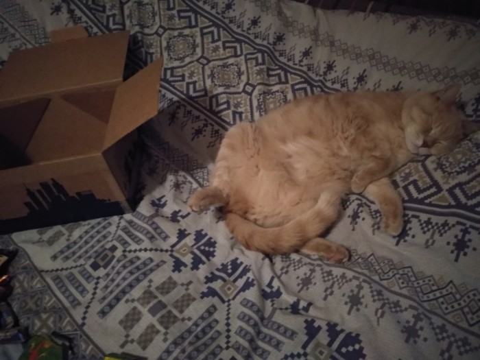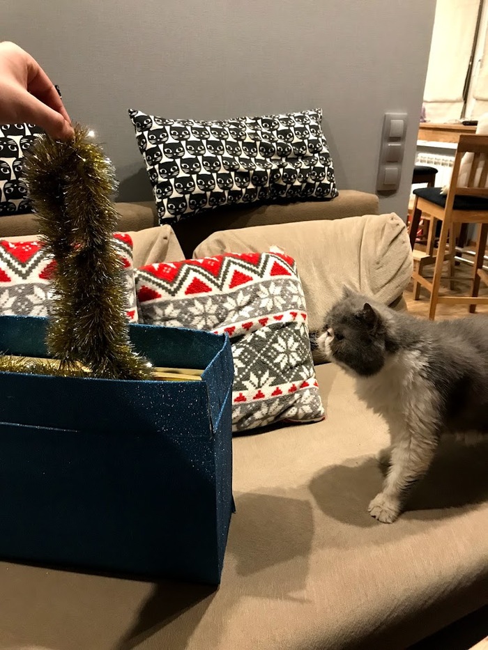 Из живности только крысюк Беляш, который не хуже котиков интересуется коробками.