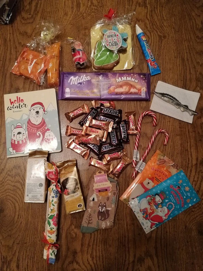 Ну вот вечер, муж пришёл, чай налит. Итак, вскрываем! Первое что попалось на глаза это ураааа батончикииии письмо моей снегурки. Оказалась снегурочка моя тёзка, тоже первый раз принимает участие, и надеется что мне подарок понравится (милая моя, знала бы ты, как я переживаю за свой подарок, который был отправлен в город Волгодонск, прям как на иголках сижу, думаю понравится или нет).